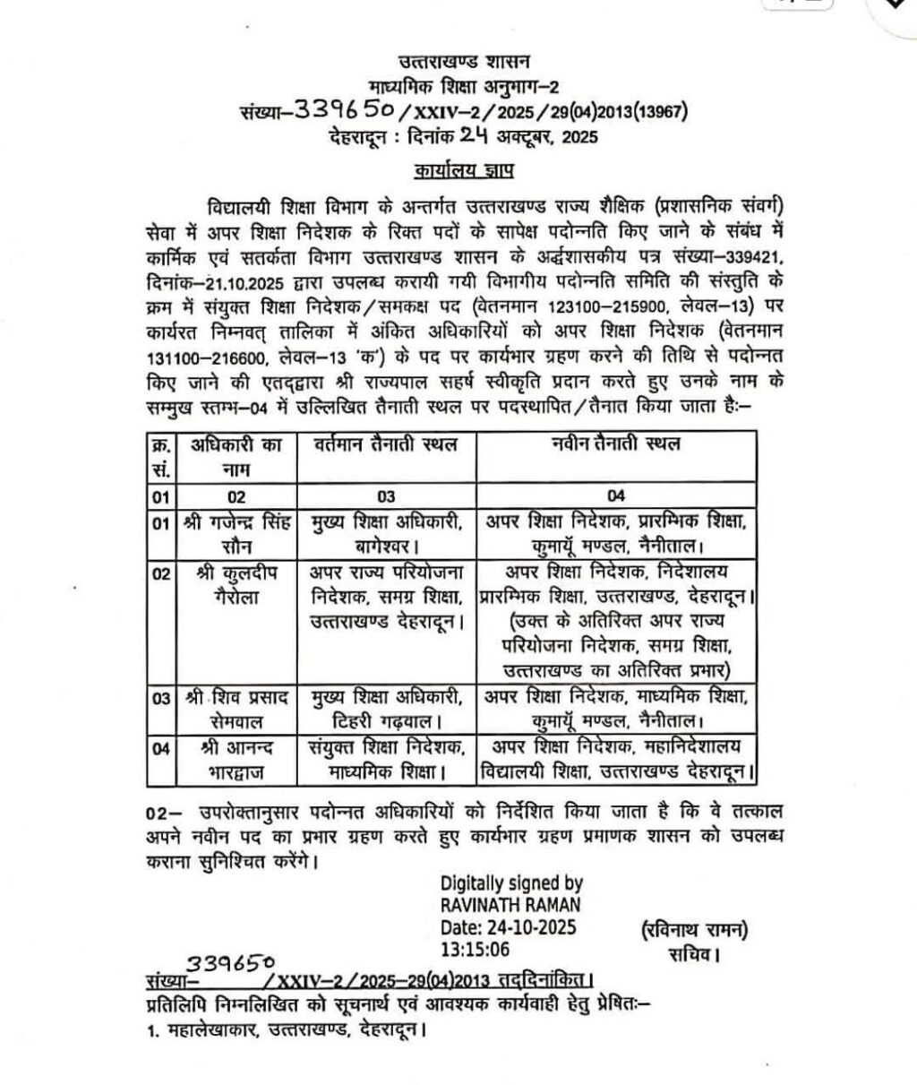 Dehradun Newsbeat Politics Uttarakhand शिक्षा विभाग में अधिकारियों की पदोन्नति के आदेश जारी। shivaeditor October 24, 2025 शिक्षा विभाग में अधिकारियों की पदोन्नति के आदेश जारी। Continue Reading Previous: उत्तराखण्ड की सुख, शांति एवं समृद्धि के लिए भगवान बद्री विशाल से प्रार्थना कीNext: महिलाओं द्वारा आयोजित भैया दूज (च्यूड़ा पूजन) समारोह में प्रतिभाग किया Leave a Reply Cancel replyYour email address will not be published. Required fields are marked *Comment * Name * Email * Website Save my name, email, and website in this browser for the next time I comment. Related Stories BLA की नियुक्ति एवं निर्वाचन आयोग द्वारा दिए गए निर्देशों पर विस्तृत चर्चा की 1 min read Dehradun Newsbeat Politics Uttarakhand World BLA की नियुक्ति एवं निर्वाचन आयोग द्वारा दिए गए निर्देशों पर विस्तृत चर्चा की November 28, 2025 NDMA के सदस्य डॉ. दिनेश कुमार असवाल की पुस्तकों का विमोचन भी किया गया 1 min read Dehradun Newsbeat Politics Uttarakhand World NDMA के सदस्य डॉ. दिनेश कुमार असवाल की पुस्तकों का विमोचन भी किया गया November 28, 2025 उत्तराखण्ड आयुर्वेद विश्वविद्यालय (UAU) से संबंधित मामले की सतर्कता विभाग से खुली जांच कराने के निर्देश दिए 1 min read Dehradun Newsbeat Politics Uttarakhand World उत्तराखण्ड आयुर्वेद विश्वविद्यालय (UAU) से संबंधित मामले की सतर्कता विभाग से खुली जांच कराने के निर्देश दिए November 28, 2025