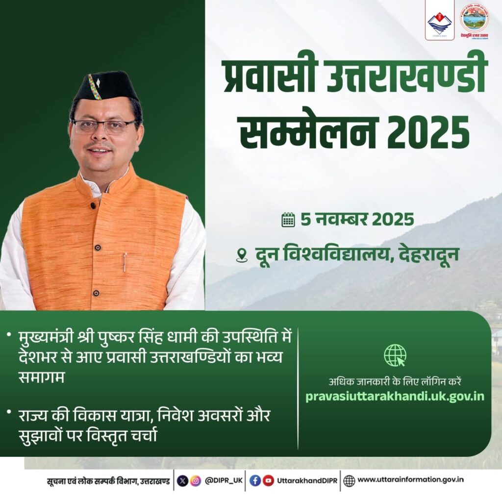 Dehradun Newsbeat Politics Uttarakhand 5 नवम्बर को दून विश्वविद्यालय में मुख्यमंत्री पुष्कर सिंह धामी करेंगे प्रवासियों के साथ सीधा संवाद shivaeditor October 25, 2025 1 min read आगामी 5 नवम्बर को दून विश्वविद्यालय, देहरादून में आयोजित प्रवासी उत्तराखण्डी सम्मेलन 2025 में मुख्यमंत्री श्री पुष्कर सिंह धामी करेंगे प्रवासियों के साथ सीधा संवाद। PravasiUttarakhandiConclave #UttarakhandConnect Uttarakhand SashktaUttarakhand Continue Reading Previous: वैली ऑफ वर्ड्स’ इंटरनेशनल लिटरेचर एंड आर्ट फेस्टिवल के 9वें संस्करण का शुभारंभ किया।Next: स्वीकृत किये जाने का अनुमोदन प्रदान किया Leave a Reply Cancel replyYour email address will not be published. Required fields are marked *Comment * Name * Email * Website Save my name, email, and website in this browser for the next time I comment. Related Stories BLA की नियुक्ति एवं निर्वाचन आयोग द्वारा दिए गए निर्देशों पर विस्तृत चर्चा की 1 min read Dehradun Newsbeat Politics Uttarakhand World BLA की नियुक्ति एवं निर्वाचन आयोग द्वारा दिए गए निर्देशों पर विस्तृत चर्चा की November 28, 2025 NDMA के सदस्य डॉ. दिनेश कुमार असवाल की पुस्तकों का विमोचन भी किया गया 1 min read Dehradun Newsbeat Politics Uttarakhand World NDMA के सदस्य डॉ. दिनेश कुमार असवाल की पुस्तकों का विमोचन भी किया गया November 28, 2025 उत्तराखण्ड आयुर्वेद विश्वविद्यालय (UAU) से संबंधित मामले की सतर्कता विभाग से खुली जांच कराने के निर्देश दिए 1 min read Dehradun Newsbeat Politics Uttarakhand World उत्तराखण्ड आयुर्वेद विश्वविद्यालय (UAU) से संबंधित मामले की सतर्कता विभाग से खुली जांच कराने के निर्देश दिए November 28, 2025